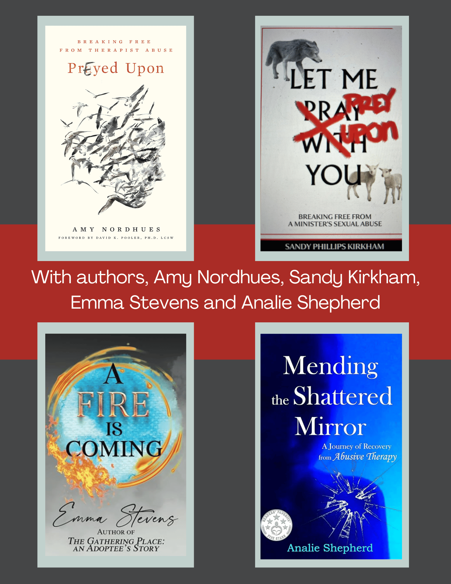 I want to join the therapist/clergy abuse Zoom book club that meets on Tuesday evenings from 5:30-7:00 pm Central time. I understand that I will get two Zooms per author/book and that we will read four books in total. I understand that Amy Nordhues will attend and facilitate all 4 groups. I realize the club starts in August 2025 and ends in November 2025, and that we will meet the last two Tuesday evenings of each month (subject to change). I know that I need to purchase all four books separately and read them before each study. I know that my membership is non-refundable. Groups capped at 10 people.